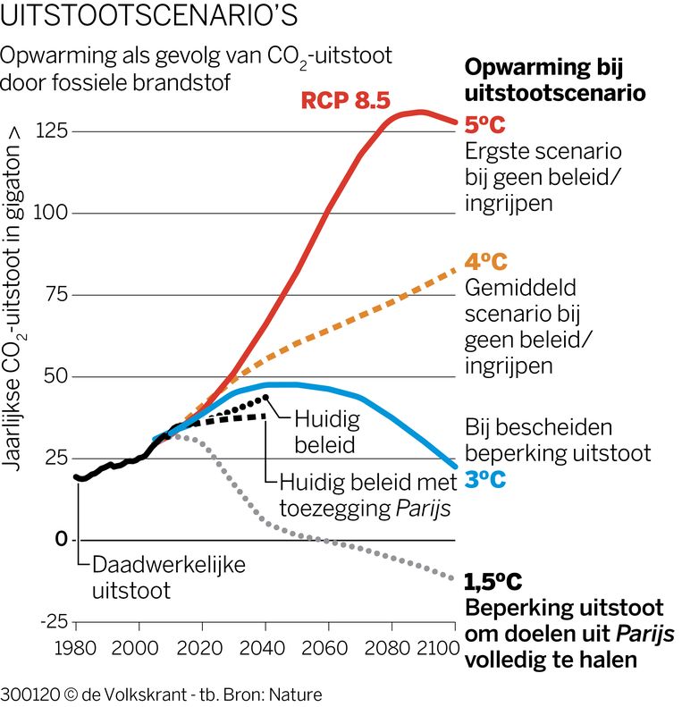 Om de toekomst van het klimaat in te kunnen schatten, stelde een onderzoeksgroep onder leiding van Van Vuuren tien jaar geleden vier uitstootscenario’s van CO2 op, met aan het ene uiterste een scenario waarbij we de CO2 -uitstoot rond 2070 tot nul beperken, en aan de andere kant een rampscenario genaamd RCP 8.5 , ‘waarin alles verkeerd gaat en de verkeerde kant op valt’, zoals hij het verwoordt.