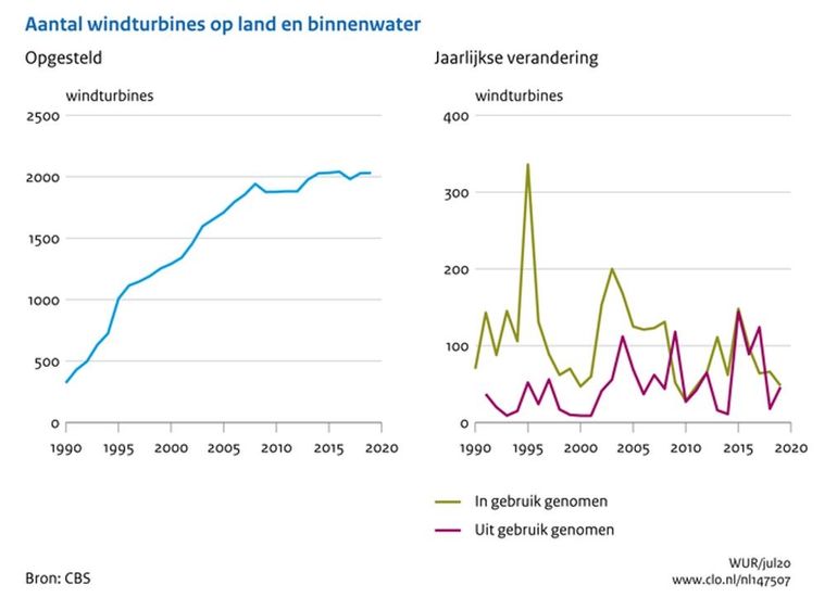 Volgens het Compendium van de Leefomgeving (CLIO) steeg het aantal windturbines op land en binnenwateren. Waren er in 1990 nog 323, in 2019 lag dit aantal op 2031. De groei op land vlakt de laatste jaren af. Het aantal windturbines dat gebouwd wordt is ongeveer even groot als het aantal oude turbines dat wordt gesloopt. In de periode 2006 tot 2016 zijn er vijf parken op zee gebouwd met in totaal 289 windturbines. Er zijn plannen voor uitbreiding van de bestaande parken en de bouw van nieuwe parken op de Noordzee.