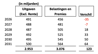 In het overzicht netto uitgaven in miljarden is het totaal aan uitgaven over de periode 2026-2031 2.953 miljard daar tegenover staat de meerjarige raming van belastingen en premies over diezelfde periode van 3.076 miljard. Een verschil van 123 miljard.