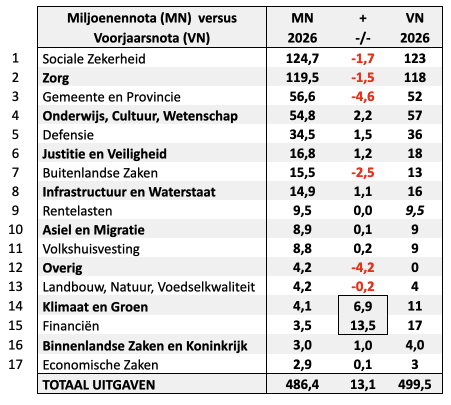 - Er is bij de departementen Klimaat en Groen en Financiën financieel gerommeld met beginstanden uit de Miljoenennota, daar is misschien een begrotingstechnische verklaring voor, maar ik kan er niet één bedenken, in ieder geval ontstaat in de Voorjaarsnota de indruk dat er op beide beleidsterreinen miljarden meevallers zijn. Terwijl in vergelijking met de Miljoenennota de uitgaven flink uit de pas lopen. Zie de bovenstaande tabel.