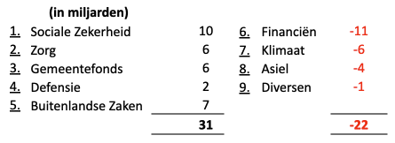 - Financiën: uitgaven dalen met 5 miljard doordat lening van Tenet afloopt en afronding van de Hersteloperatie Toeslagen.